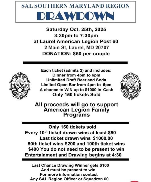 Southern Maryland Drawdown!! Dinner for Two, Draft beer and soda, and Cash Prizes$$$. Click for more details! Saturday, 25 October 2025, 3:30-7:30 PM in Allen Hall!